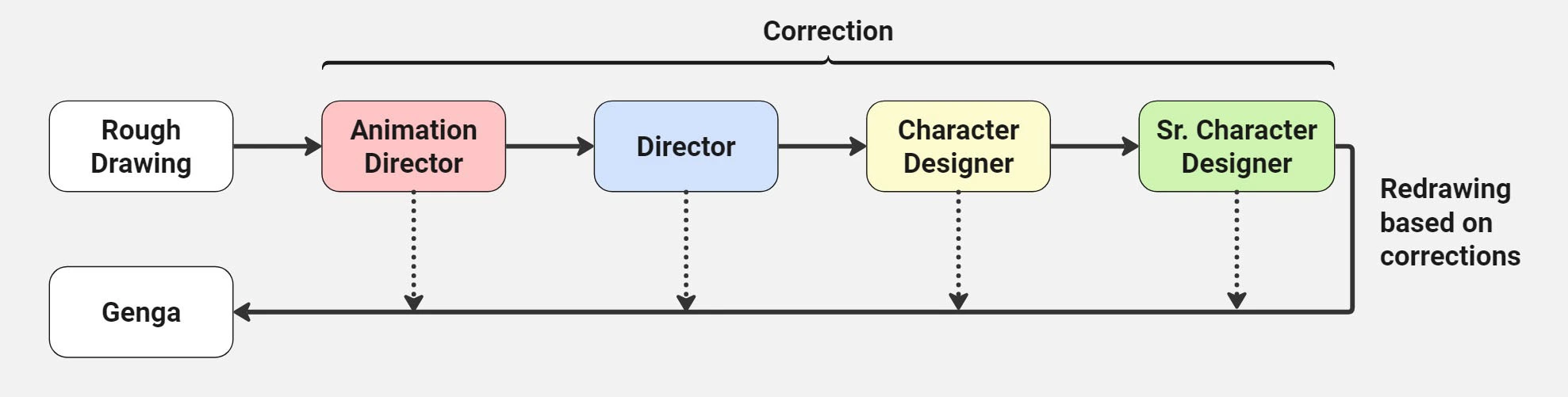 Genga means tie-down drawings or raw keyframes, drawn by genga artists. The drawn genga goes though a multi-step process.